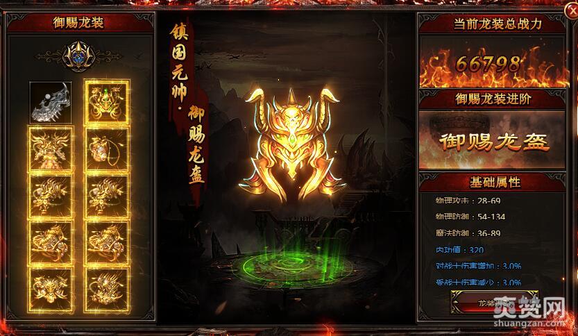 镇国元帅·御赐龙盔。物理攻击:28-69,物理防御:54-134,魔法防御:36-89,内功值:120,对战士伤害增加:3.0%,受战士伤害减少:3.0%。
