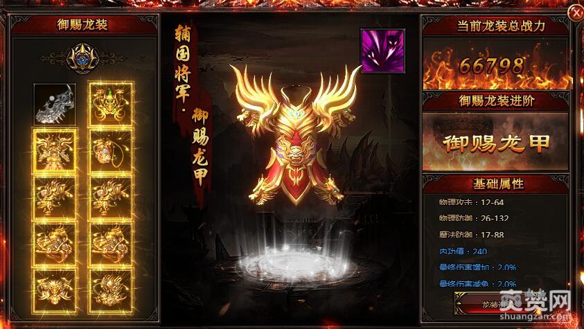 辅国将军·御赐龙甲。物理攻击:12-64,物理防御:26-132,魔法防御:17-88。内功值:240,最终伤害增加:2.0%,最终伤害减免:2.0%。