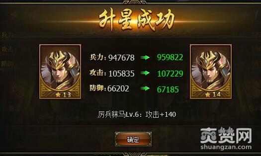 13星升14星时,兵力:947678->959822,攻击:105835->107229,防御:66202->67185。厉兵秣马Lv.6:攻击+140。