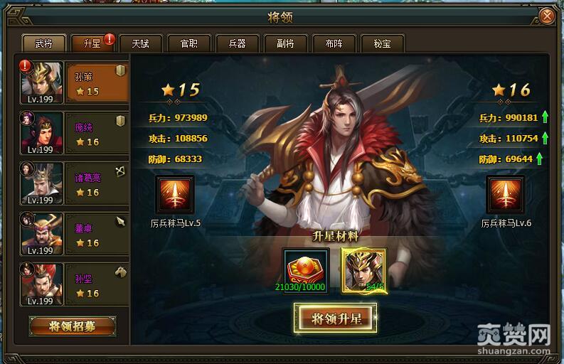 孙策15星时,兵力:973989,攻击:108856,防御:68333,升星需要消耗10000升星丹,孙策5个。