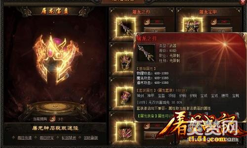 玩家可将各种屠龙装备,佩戴在角色的副装槽里,这些装备不会与普通装备发生冲突。其中,屠龙护腕、屠龙宝戒两件装备,可同时佩戴两件。玩家身上若能集齐10件屠龙装备,可以激活无双伤害减免30%的效果。玩家可获得屠龙装备后,还能对装备进行进阶操作,提高装备的属性效果。屠龙装备进阶要消耗一些屠龙神石,随着装备进阶等级提升,消耗的屠龙神石会增多。