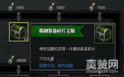 3000点战功达成后。战功奖励可以获得精钢装备碎片宝箱10个。使用后随机获得一件精钢装备碎片。不可出售。获得方式:战功奖励。