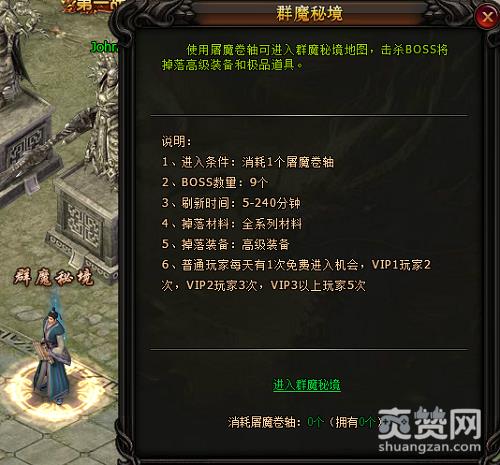 一卷在手,秘境你有!玩家使用1个屠魔卷轴就能开启通往秘境的神秘大门,踏上充满冒险与探索的未知之旅。这么摄人心魄的深幽之地,可以闯荡几次呢?普通玩家每天有1次免费进入机会,VIP1玩家2次,VIP2玩家3次,VIP3以上玩家能有5次之多。而群魔秘境开启的时间是在每天14:00--15:00玩家一点要注意时间,不要错过了哦!