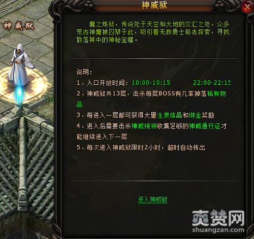 每天的10:00-12:00和22:00--24:00是神威狱开放的时间。神威狱一共13层,每层均有BOSS镇守,玩家进入下一层时需要击杀神威统领,才能获得【神威通行证】,玩家每闯入下一层就可获得大量金币和注灵结晶奖励。得到的奖励会自动进入背包,背包的空间要足够大,如果你回收物品,就会自动传出,在想进入神威狱就只能等下个入口开放时间了。每次进去神威狱限时2小时,超时了会自动传出。