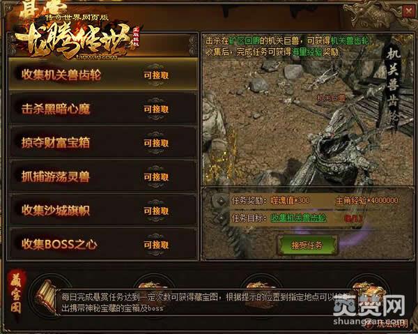 为什么说贪玩传奇世界网页版《龙腾传世》藏宝图这么受玩家喜爱?第一,自然是因为获取他的方式相对简单且成本低;第二,说起来藏宝图奖励那可是相当丰富,大量红色武器、100W经验箱、金珠精华、灵兽丹等都可以通过挖图得到;第三,挖宝还存在多种惊喜因素,特别是能够挖出boss时,这个bOSS只有你能,别人抢都不能抢,是不是特别棒。