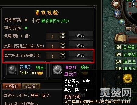 此外,如果获得物品灵凰丹和真龙丹也可领取离线经验。一颗灵凰丹可以兑换1小时1.8倍的离线经验,价格是100元宝。每一颗真龙丹可以兑换1小时3倍的离线经验,价格是200元宝。灵凰丹和真龙丹在923yx《七杀》中都是很难产出的。