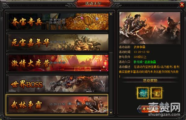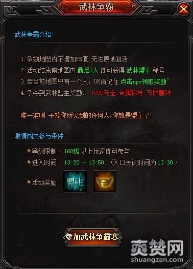 我去玩《炎龙传奇》武林争霸活动时间:13:20-13:50;玩家参与条件是角色等级达到80。活动入口在威龙城-武林争霸的NPC处。活动开启10分钟内可进入活动地图,10分钟之后入口关闭。从活动入口关闭至活动结束,期间内地图中只剩最后一个人可申请成为武林盟主,成为武林盟主后可获得奖励 ——“武林盟主”称号、1000元宝。还在等什么?快来我去玩《炎龙传奇》来一场畅快淋漓的战斗来证明你的实力!