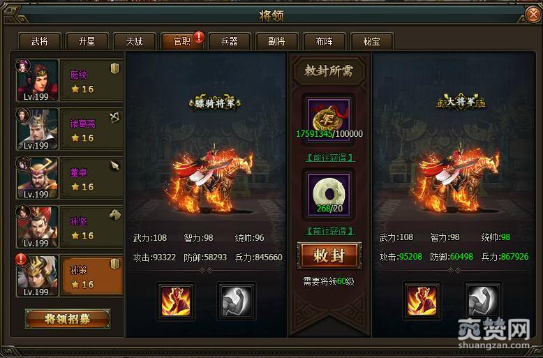 从骠骑将军到大将军 敕封所需军功100000,美玉20个,需要将领60级