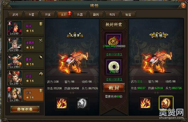 从大将军到吴候 敕封所需军功200000,美玉30个,需要将领60级