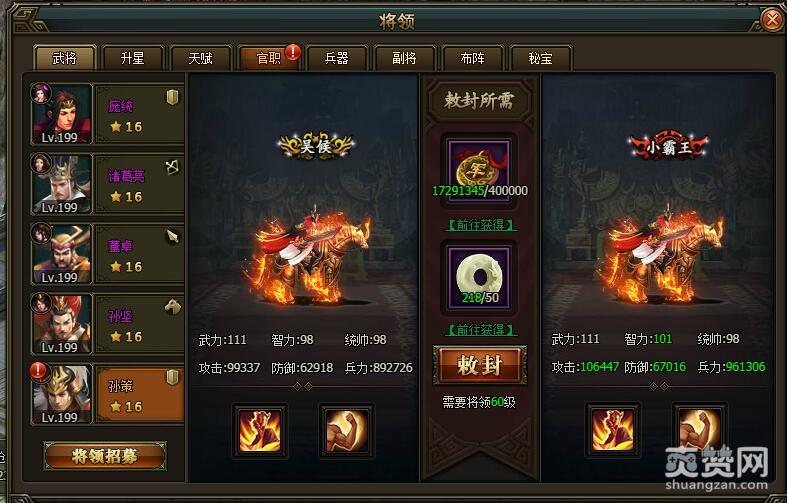从吴侯到小霸王 敕封所需军功400000,美玉50个,需要将领60级
