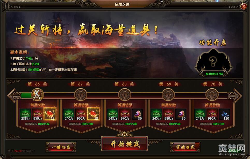 在XY游戏《刺沙》中,之前的攻略我们已经给大家介绍了四大神器的激活条件,也把神魔之塔通到了第65关,今天我们就从第66关开始,看看66~70关的BOSS长啥样,威力如何,血量多少,等级多高吧。一起来看看吧。