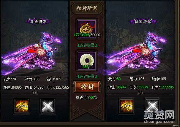 从奋威将军到辅国将军 敕封所需军功60000,美玉4个,需要将领60级