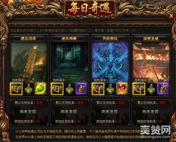 在全服击杀900级以上的BOSS有几率发现遗忘沼泽、迷失神殿、天机祭坛和洪荒圣城秘境挑战入口,每天每个秘境只可以发现一次哦!难怪叫每日奇遇,玩家们赶快来奇遇你的秘境吧!听说世界BOSS身上有几率掉落不同级别得奇遇幸运丹,使用后可以大幅度提升秘境的附加发现几率哦!