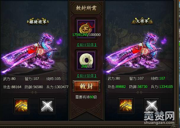 从骠骑将军到大将军 敕封所需军功100000,美玉20个,需要将领60级