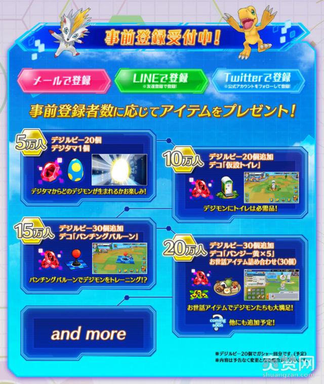 《数码宝贝 ReArise》目前已于日本展开事前登录,根据事前登录的人数不同,玩家可以获得可用来转蛋的「数码宝石(デジ儿ビー)」或是能孵出数码宝贝的「数码蛋」等虚拟道具。