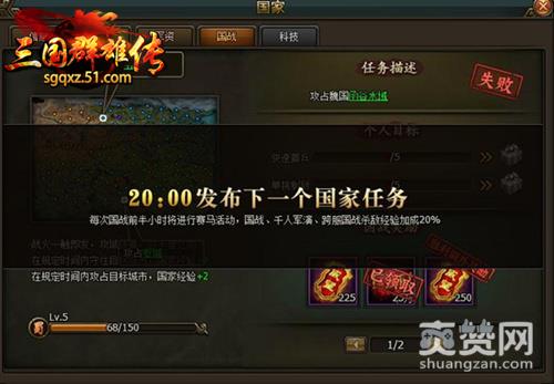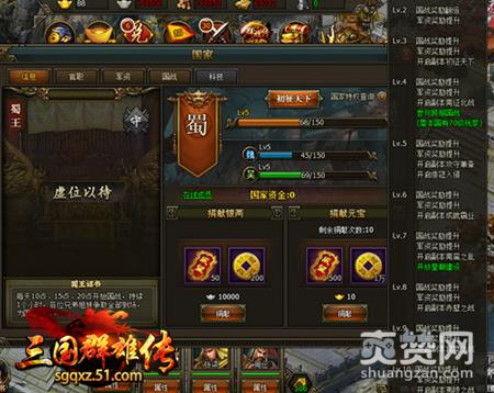 51《三国群雄传》国家系统由国家等级,官职,国家发展,军资,国家科技,以及国战等元素所组成。随着国家等级的提高,所属国家成员会获得相应的国家特权。国家经验的主要来源是国战,国战的成败决定了一个国家等级提高的速度。