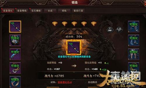 获取装备后自然就是培养了,首先来了解下强化,装备的强化需要依靠大量的铜钱和不同档次的强化石,每次强化都需要消耗大量的强化石,同时必提升若干成长值,当成长值达到百分百后则强化星级增加1点,星级越高,消耗的强化石也就越高,当然星级给提供的战斗力也就越多。