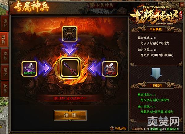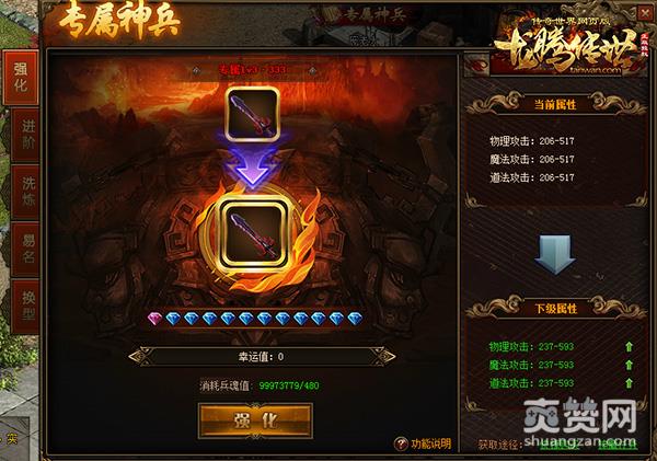 强化满级就真的满足了吗?传奇世界网页版《龙腾传世》还有专属神兵进阶的功能,神兵强化等级达到蓝钻+6后可进行进阶,进阶以后还能获得暴走技能,只要进入暴走模式,每次攻击都必定暴击,刀刀飘红的快乐谁用谁知道。专属神兵进阶到LV3以后,洗练神兵可以大幅提升神兵的传奇属性。专属神兵材料可从神魔任务、神魔商店、商城获得。