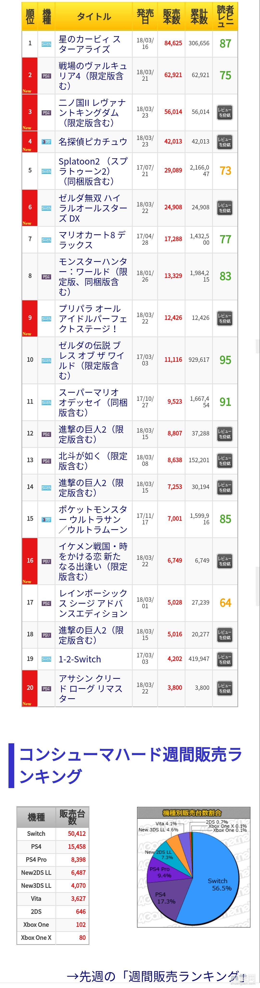 PS4《战场女武神4》(包括限定版)、PS4《二之国2 亡灵国度》(包括限定版)、3DS《名侦探皮卡丘》三款本周发售的新游戏的首周销量成绩分别为62921份、56014份、42013份。NS版《星之卡比》第二周依旧表现优异,卖出了84625份。