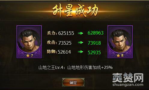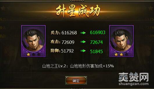 1星升2星,兵力:616268变616903,攻击:72609变72674,防御:51792变51845,山地之王Lv.1变山地之王Lv.2,升星材料需要升星丹20颗,将领需达到10级。
