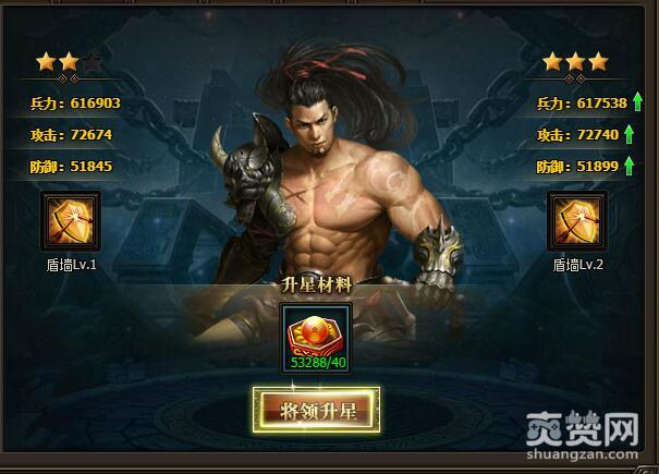 2星升3星,兵力:616903变617538,攻击:72674变72740,防御:51845变51899,盾墙Lv.1变盾墙Lv.2,升星材料需要升星丹40颗,将领需达到20级。