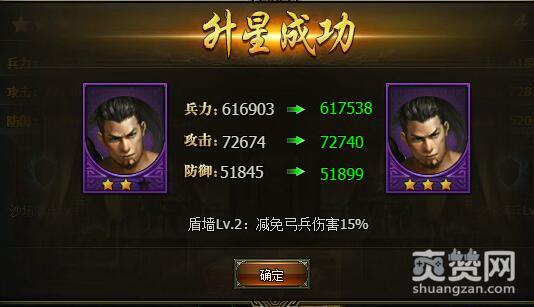 升到20级后,2星升3星,兵力:616903变617538,攻击:72674变72740,防御:51845变51899,盾墙Lv.1变盾墙Lv.2,盾墙Lv.2:减免弓兵伤害15%。