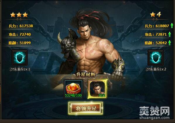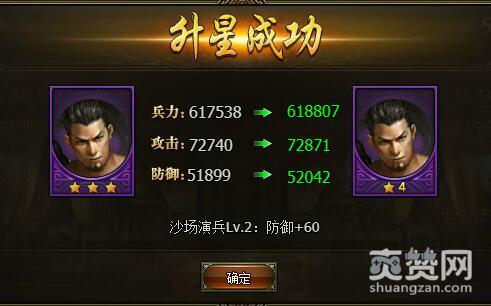 升到30级后,3星升4星,兵力:617538变618807,攻击:72740变72871,防御:51899变52042,沙场演兵Lv.1变沙场演兵Lv.2,沙场演兵Lv.2:防御+60。
