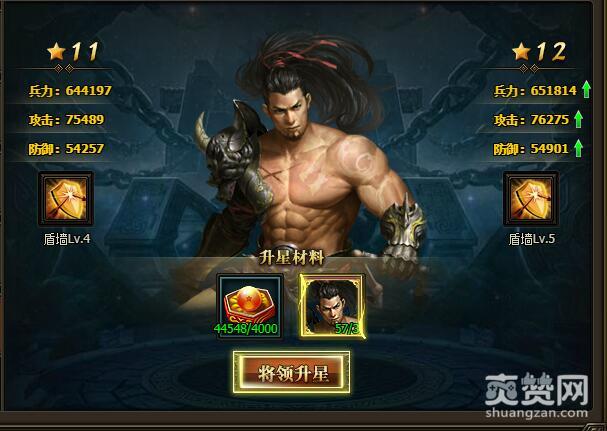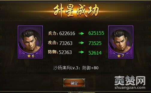 升到50级后,5星升6星,兵力:620077变622616,攻击:73002变73263,防御:52149变52363,盾墙Lv.2变盾墙Lv.3,盾墙Lv.3:减免弓兵伤害20%。