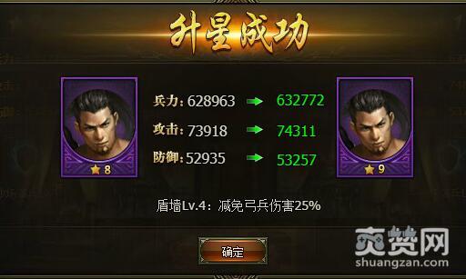 升到80级后,8星升9星,兵力:628963变632772,攻击:73918变74311,防御:52935变53257,盾墙Lv.3变盾墙Lv.4,盾墙Lv.4:减免弓兵伤害25%。