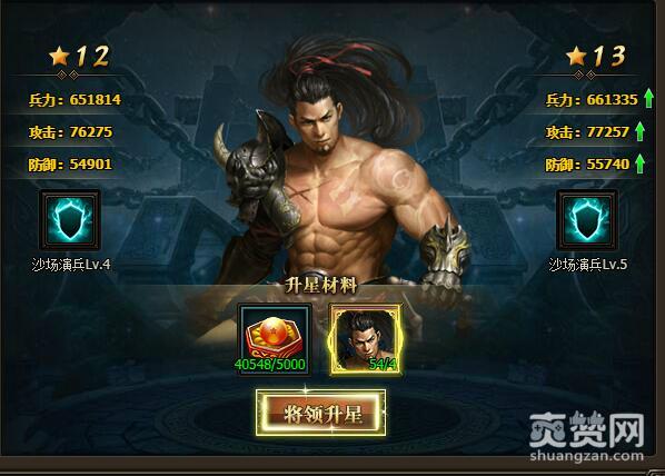 4星升5星,兵力:618807变620077,攻击:72871变73002,防御:52042变52149,山地之王Lv.2变山地之王Lv.3,升星材料需要升星丹200颗,许褚1个,将领需达到40级。