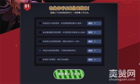 在2018年3月30日至4月7日活动期间内,前往活动页面,从五条备选谎言中选择一条你心中的最假谎言,即可领取超级豪华的愚人节礼包一份!