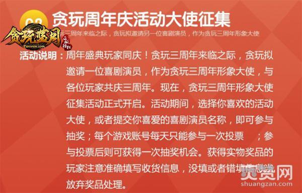 随着周年庆的脚步越来越近,贪玩游戏及旗下的《贪玩蓝月》等诸多游戏产品进入了周年庆的紧锣密布的活动布置,此次贪玩游戏三周年,将会全网征集贪玩周年庆明星大使征集,究竟哪位一线明星能脱颖而出,成为贪玩首位周年庆大使,这值得期待!