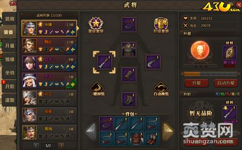 在43u《兵法三国》武将系统中,玩家可以清楚的查看到武将的基本属性和使用突飞令,而且有的武将还有独特技能哦!把霸气的装备穿在武将身上,这样武将的能力也将得到提升哦!想要装备变得强大就使用器升星石和装备碎片来升阶装备哦!