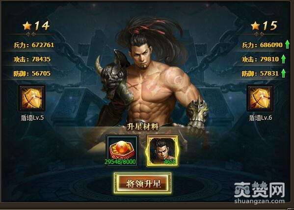 14星升15星,兵力:672761变686090,攻击:78435变79810,防御:56705变57831,盾墙Lv.5变盾墙Lv.6,升星材料需要升星丹8000颗,许褚5个,将领需达到140级。