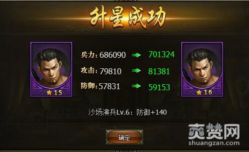 满足条件150级后,可以15星升16星,兵力:686090变701324,攻击:79810变81381,防御:57831变59153,沙场演兵Lv.5变沙场演兵Lv.6,沙场演兵Lv.6:防御+140。