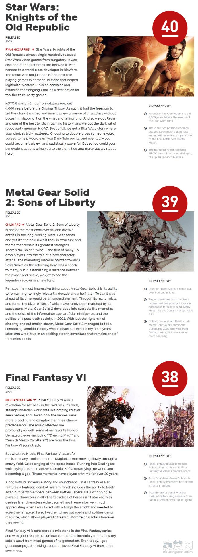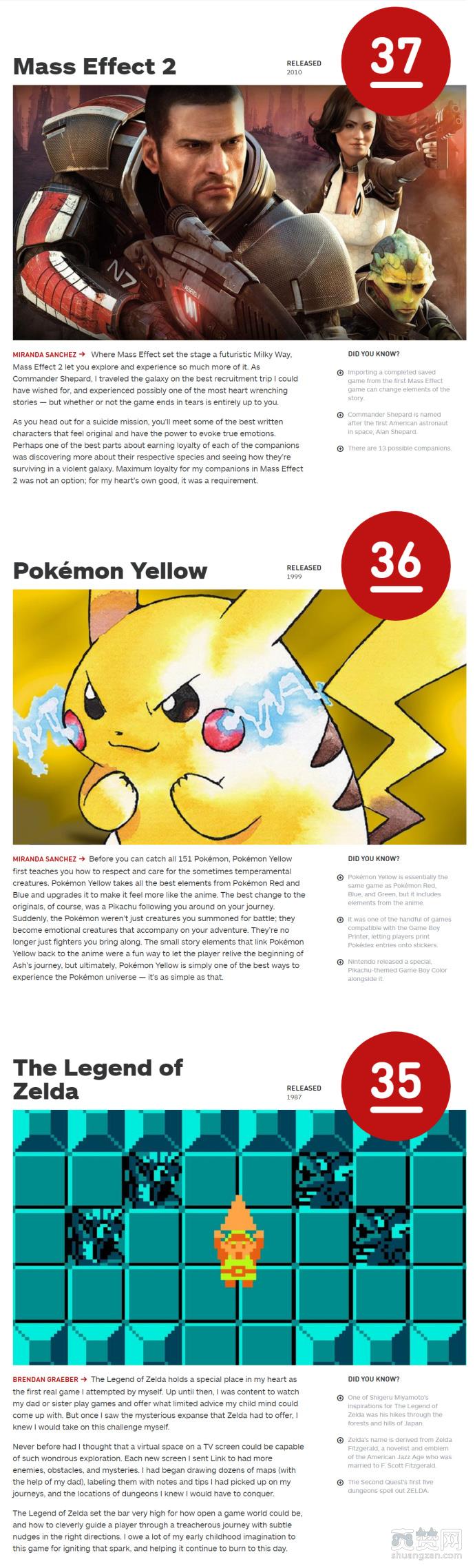 第40——35位:40《星球大战:共和国武士》、39《合金装备:自由之子》、38《最终幻想6》、37《质量效应2》、36《精灵宝可梦 黄》、35《塞尔达传说》