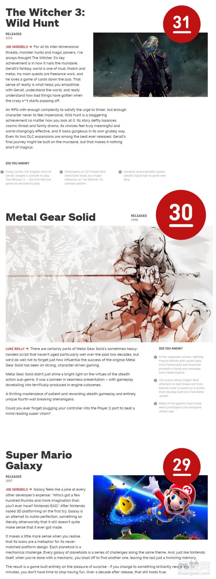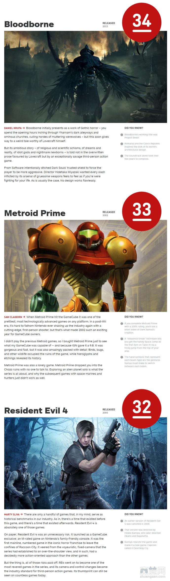 第34——29位:34《血源诅咒》、33《银河战士:融合》、32《生化危机4》、31《巫师3:狂猎》、30《合金装备》、29《超级马里奥 银河》