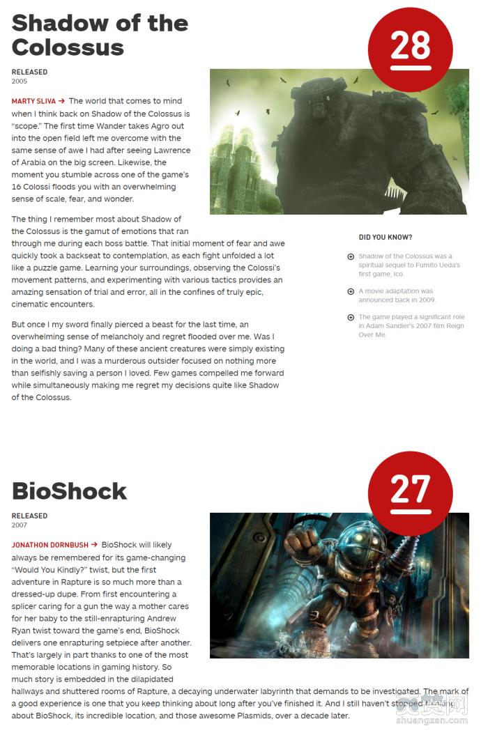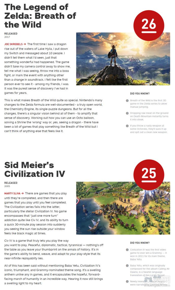 第28——25位:28《汪达与巨像》、27《生化奇兵》、26《塞尔达传说:荒野之息》、25《文明4》