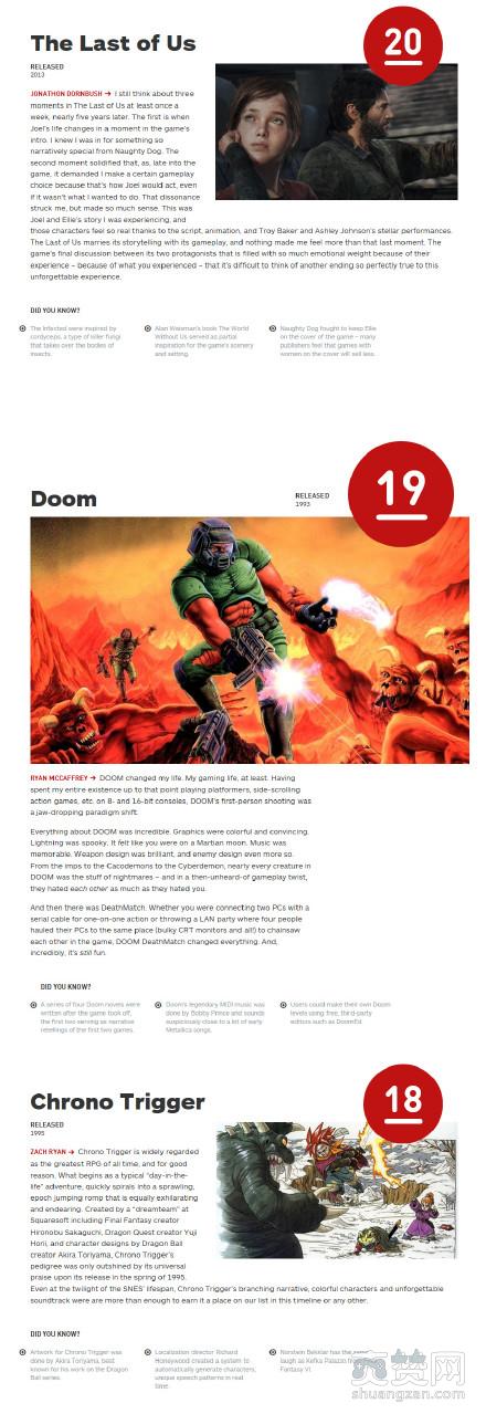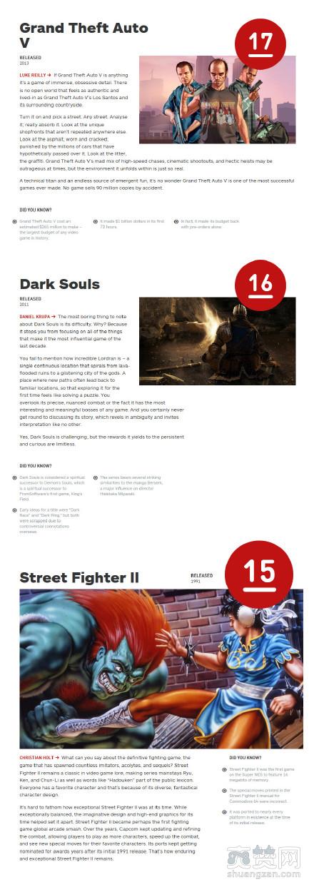 第20——15位:20《最后生还者》、19《DOOM》、18《时空之轮》、17《侠盗飞车5》、16《黑暗之魂》、15《街头霸王2》