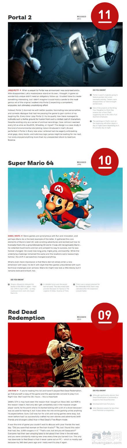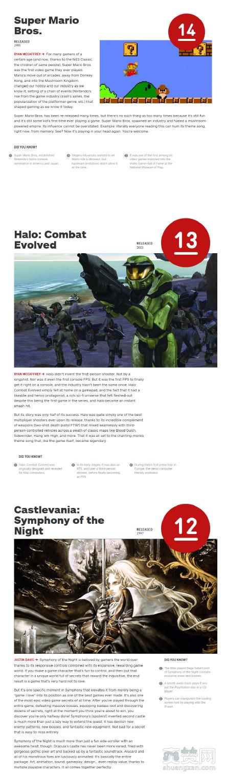 第14——9位:14《超级马里奥兄弟》、13《光环:战争进化》、12《恶魔城:月下夜想曲》、11《传送门2》、10《超级马里奥64》、9《荒野大镖客》
