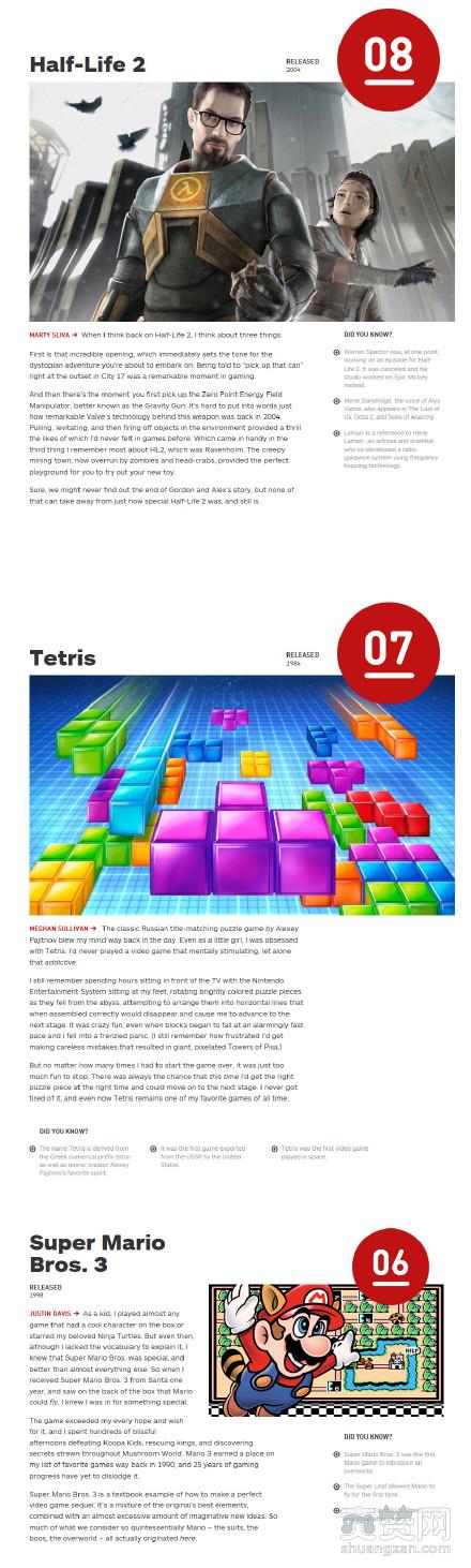 第8——4位:8《半条命2》、7《俄罗斯方块》、6《超级马里奥兄弟3》、5《塞尔达传说:众神三角力量》、4《超级银河战士》