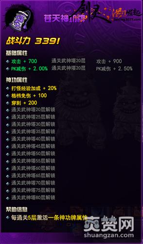 9377《剑灵·洪门崛起》“武神塔试炼”玩法的通关奖励,包括海量等级经验、大量银币,以及升星玄铁、橙色品质材料五行石、元宝、红色品质道具通络酒等稀有物品。而神功牌则能够带来攻击、PK减伤这两大基础属性,以及打怪经验加成”、“格挡免伤”、“穿刺”等特殊属性的加成