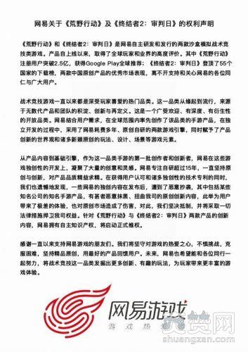 在这篇声明中,网易称自己的《荒野行动》和《终结者2》都拥有原创自研的游戏引擎。网易不断坚称自己是独创的创新者,不仅如此,网易还叫苦不迭声称自己才是受害者。《荒野行动》和《终结者2:审判日》遭到了恶意抄袭和恶意抹黑,网易将开启维权。
