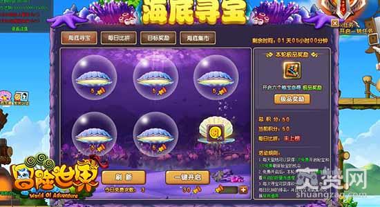 海底寻宝活动中,玩家每日都可以获得1次免费开启秘宝和3次免费刷新秘宝的机会,开启六个秘宝后必定获得极品道具。寻宝后可获得相应积分,积分可以参与每日比拼的排名,并且可在海底集市中兑换稀有道具。