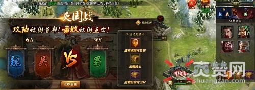 合纵,合众弱以攻一强;连横,事一强以攻众弱。在每周六的20:00-20:30,即是8090兵法三国中的灭国战时间,活动开始后系统将随机选出两个攻方和一个守方。攻守方在活动时间内都会在国都刷出国主、皇家守卫军和皇家御林军,同时在5个国境关口也都会刷出守关将领,皇家守卫军和皇家御林军。