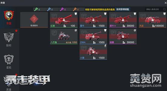 腾讯《暴走装甲》的载具工厂中共有帝国、联邦、星拓、英雄四大阵营,每一个阵营中包含不同的装甲车型。帝国阵营中共有八种类型的装甲,帝国阵营装甲均为红色外观,在战场中极为抢眼。