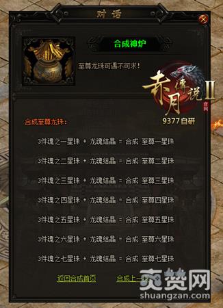 想要合成9377《赤月传说2》至尊七龙珠的玩家可以找到合成神炉进行至尊合成,合成条件为3件相同的魂之龙珠加上1个龙魂结晶,大家一起努力变强吧~!