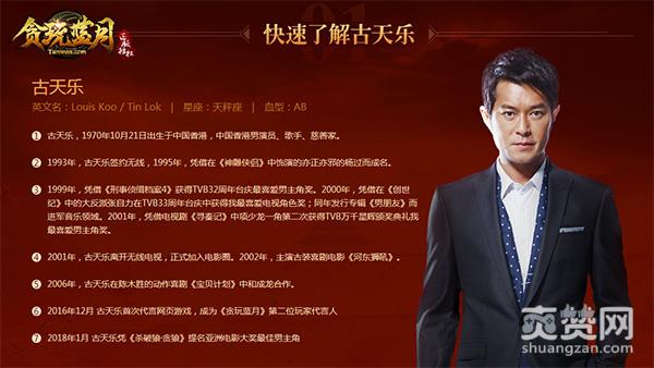 1995年,凭借在《神雕侠侣》中饰演的亦正亦邪的杨过,古天乐一炮而红,1999年,Mr.酷又凭借《刑事侦缉档案4》获得TVB32周年台庆最喜爱男主角奖。2016年12月,古天乐首次代言网页游戏,成为《贪玩蓝月》第二位玩家代言人,2018年1月,古天乐凭《杀破狼·贪狼》提名亚洲电影大奖最佳男主角。现在王者归来服开启,战就要战个痛快。