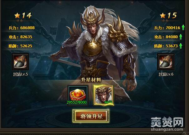 满足条件140级后,可以14星升15星,兵力:686808变700416,攻击:82635变84080,防御:52625变53673,践踏Lv.5变践踏Lv.6,践踏Lv.6:对盾兵伤害+35%。