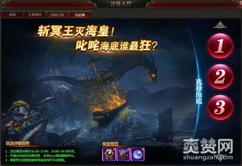 除了战神之路外,战场大厅中的无边海活动也是大家大展拳脚的武台。在每天的16:30-17:00、19:00-19:30,所有等级达到90级的玩家均可参与。在无边海中完成任务后可获得经验、道具、军工值等奖励,同时也会获得国家积分,国家积分进度奖励所有成员均可手动领取。此外无边海活动的BOSS归属于最后一击的玩家,抢到BOSS归属并击杀BOSS之后则会有归属掉落。